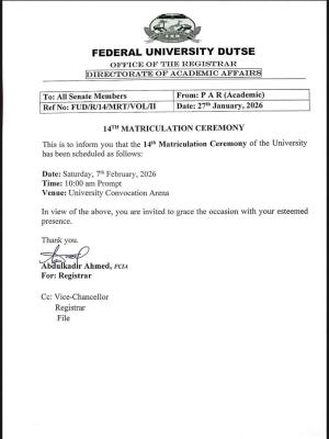 Federal University Dutse( FUDutse) is set to officially drink its newest cohort of scholars during its forthcoming 14th Matriculation Ceremony.